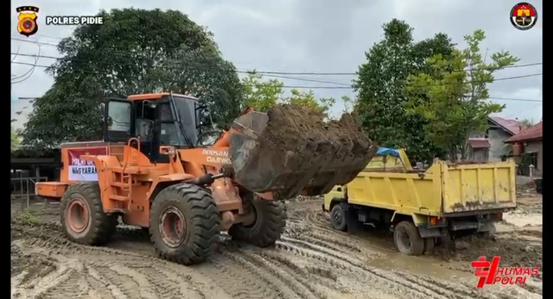 Kapolres Pidie AKBP Jaka Mulyana, SIK, MIK, menyampaikan bahwa bantuan alat berat dari Kapolri sangat membantu percepatan penanganan dampak banjir, khususnya pada pembersihan material berat yang tidak dapat ditangani secara manual.
